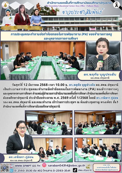 วันศุกร์ที่ 12 ธันวาคม 2568 เวลา 10.00 น. ดร.หฤทัย บุญประดับ ผอ.สพม.ปทุมธานี เป็นประธานการประชุมคณะทำงานจัดทำข้อตกลงในการพัฒนางาน (PA) ของข้าราชการครูและบุคลากรทางการศึกษา ตำแหน่งผู้อำนวยการสำนักงานเขตพื้นที่การศึกษา สำนักงานเขตพื้นที่การศึกษามัธยมศึกษาปทุมธานี ประจำปีงบประมาณ พ.ศ. 2569 ครั้งที่ 1/2568 โดยมี ดร.เรนิษรา ภู่อ่อน รอง ผอ.สพม.ปทุมธานี และคณะทำงาน เข้าร่วมการประชุมฯ ณ ห้องประชุมชาญ พวงเพ็ชร ชั้น1 สำนักงานเขตพื้นที่การศึกษามัธยมศึกษาปทุมธานี