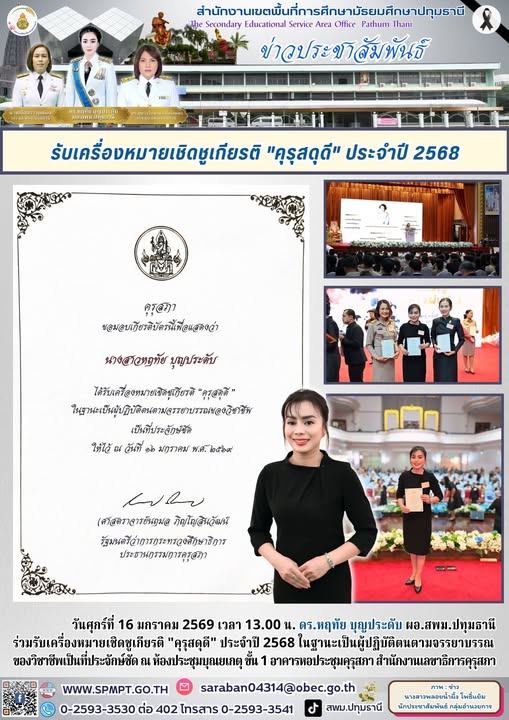 วันศุกร์ที่ 16 มกราคม 2569 เวลา 13.00 น. ดร.หฤทัย บุญประดับ ผอ.สพม.ปทุมธานี ร่วมรับเครื่องหมายเชิดชูเกียรติ “คุรุสดุดี” ประจำปี 2568 ในฐานะเป็นผู้ปฏิบัติตนตามจรรยาบรรณของวิชาชีพเป็นที่ประจักษ์ชัด ณ ห้องประชุมบุณยเกตุ ขั้น 1 อาคารหอประชุมคุรุสภา สำนักงานเลขาธิการคุรุสภา