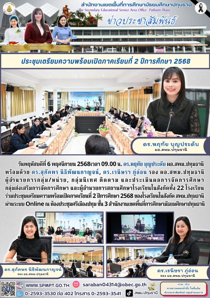 วันพฤหัสบดีที่ 6 พฤศจิกายน 2568เวลา 09.00 น. ดร.หฤทัย บุญประดับ ผอ.สพม.ปทุมธานี พร้อมด้วย ดร.สุภัคพร นิธิพัฒนกาญจน์, ดร.เรนิษรา ภู่อ่อน รอง ผอ.สพม.ปทุมธานี ผู้อำนวยการกลุ่ม/หน่วย, กลุ่มนิเทศ ติดตาม และประเมินผลการจัดการศึกษา กลุ่มส่งเสริมการจัดการศึกษา และผู้อำนวยการสถานศึกษาโรงเรียนในสังกัดทั้ง 22 โรงเรียน ร่วมประชุมเตรียมความพร้อมเปิดภาคเรียนที่ 2 ปีการศึกษา 2568 ของโรงเรียนในสังกัด สพม.ปทุมธานี ผ่านระบบ Online ณ ห้องประชุมศรีเมืองปทุม ชั้น 3 สำนักงานเขตพื้นที่การศึกษามัธยมศึกษาปทุมธานี