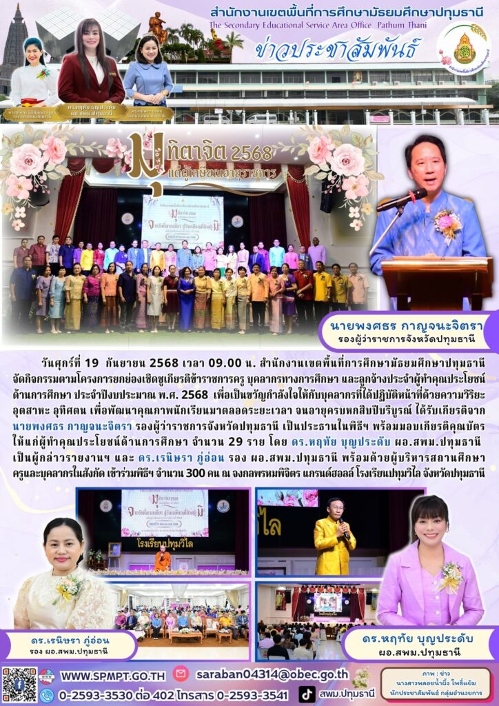 วันศุกร์ที่ 19 กันยายน 2568 เวลา 09.00 น. สำนักงานเขตพื้นที่การศึกษามัธยมศึกษาปทุมธานี จัดกิจกรรมตามโครงการยกย่องเชิดชูเกียรติ ข้าราชการครู บุคลากรทางการศึกษา และลูกจ้างประจำผู้ทำคุณประโยชน์ ด้านการศึกษา ประจำปีงบประมาณ พ.ศ. 2568 เพื่อเป็นขวัญกำลังใจให้กับบุคลากรที่ได้ปฏิบัติหน้าที่ด้วยความวิริยะ อุตสาหะ อุทิศตน เพื่อพัฒนาคุณภาพนักเรียนมาตลอดระยะเวลา จนอายุครบหกสิบปีบริบูรณ์ ได้รับเกียรติจาก นายพงศธร กาญจนะจิตรา รองผู้ว่าราชการจังหวัดปทุมธานี เป็นประธานในพิธีฯ พร้อมมอบเกียรติคุณบัตร ให้แก่ผู้ทำคุณประโยชน์ด้านการศึกษา จำนวน 29 ราย โดย ดร.หฤทัย บุญประดับ ผอ.สพม.ปทุมธานี เป็นผู้กล่าวรายงานฯ และ ดร.เรนิษรา ภู่อ่อน รอง ผอ.สพม.ปทุมธานี พร้อมด้วยผู้บริหารสถานศึกษา ครูและบุคลากรในสังกัด เข้าร่วมพิธีฯ จำนวน 300 คน ณ จงกลพรหมพิจิตร แกรนด์ฮอลล์ โรงเรียนปทุมวิไล จังหวัดปทุมธานี
