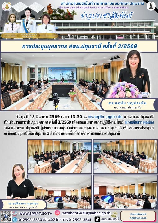 วันพุธที่ 18 มีนาคม 2569 เวลา 13.30 น. ดร.หฤทัย บุญประดับ ผอ.สพม.ปทุมธานี เป็นประธานการประชุมบุคลากร ครั้งที่ 3/2569 เพื่อมอบนโยบายการปฏิบัติงาน โดยมี นางอลิสสรา ผุดผ่อง รอง ผอ.สพม.ปทุมธานี ผู้อำนวยการกลุ่ม/หน่วย และบุคลากร สพม.ปทุมธานี เข้าร่วมการประชุมฯ ณ ห้องประชุมศรีเมืองปทุม ชั้น 3 สำนักงานเขตพื้นที่การศึกษามัธยมศึกษาปทุมธานี
