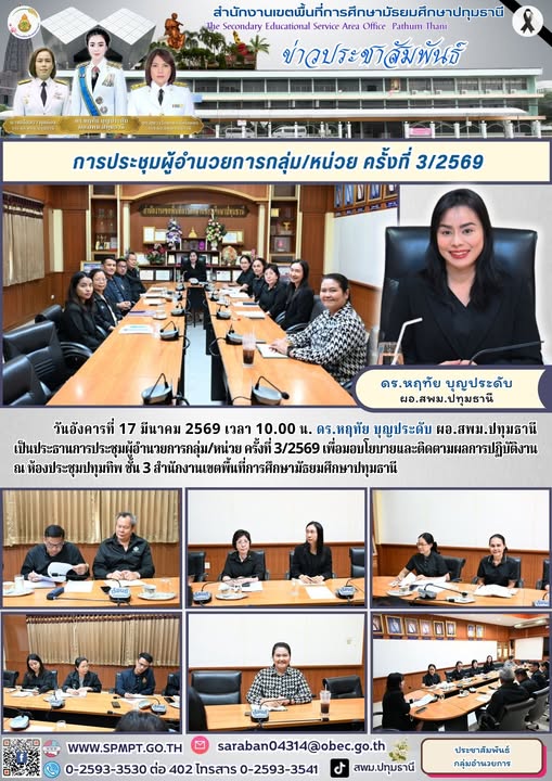 วันอังคารที่ 17 มีนาคม 2569 เวลา 10.00 น. ดร.หฤทัย บุญประดับ ผอ.สพม.ปทุมธานี เป็นประธานการประชุมผู้อำนวยการกลุ่ม/หน่วย ครั้งที่ 3/2569 เพื่อมอบโยบายและติดตามผลการปฏิบัติงาน ณ ห้องประชุมปทุมทิพ ชั้น 3 สำนักงานเขตพื้นที่การศึกษามัธยมศึกษาปทุมธานี
