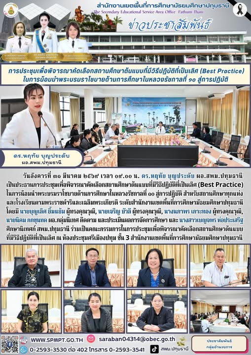 วันอังคารที่ ๓๑ มีนาคม ๒๕๖๙ เวลา ๐๙.๐๐ น. ดร.หฤทัย บุญประดับ ผอ.สพม.ปทุมธานี เป็นประธานการประชุมเพื่อพิจารณาคัดเลือกสถานศึกษาต้นแบบที่มีวิธีปฏิบัติที่เป็นเลิศ (Best Practice) ในการน้อมนำพระบรมราโชบายด้านการศึกษาในหลวงรัชกาลที่ ๑๐ สู่การปฏิบัติ สำหรับสถานศึกษาทุกแห่งและโรงเรียนตามพระราชดำริและเฉลิมพระเกียรติ ระดับสำนักงานเขตพื้นที่การศึกษามัธยมศึกษาปทุมธานี โดยมี นายบุญเลิศ ยิ้มแย้ม ผู้ทรงคุณวุฒิ, นายเจริญ บัวลี ผู้ทรงคุณวุฒิ, นางนภาพร เกาะทอง ผู้ทรงคุณวุฒิ, นายนิคม กกขุนทด ผอ.กลุ่มนิเทศ ติดตาม และประเมินผลการจัดการศึกษา และ นางสาวเบญจพร ห่อประเสริฐ ศึกษานิเทศก์ สพม.ปทุมธานี ร่วมเป็นคณะกรรมการในการประชุมเพื่อพิจารณาคัดเลือกสถานศึกษาต้นแบบที่มีวิธีปฏิบัติที่เป็นเลิศ ณ ห้องประชุมศรีเมืองปทุม ชั้น 3 สำนักงานเขตพื้นที่การศึกษามัธยมศึกษาปทุมธานี