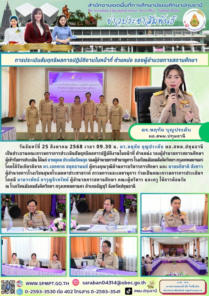 วันจันทร์ที่ 25 สิงหาคม 2568 เวลา 09.30 น. ดร.หฤทัย บุญประดับ ผอ.สพม.ปทุมธานี เป็นประธานคณะกรรมการการประเมินสัมฤทธิผลการปฏิบัติงานในหน้าที่ ตำแหน่ง รองผู้อำนวยการสถานศึกษาผู้เข้ารับการประเมิน ได้แก่ นายอุดม ประเดิมรัตนกุล รองผู้อำนวยการชำนาญการ โรงเรียนมัธยมสังคีตวิทยา กรุงเทพมหานคร โดยได้รับเกียรติจาก ดร.เอกพรต สมุทธานนท์ ผู้ทรงคุณวุฒิด้านการบริหารการศึกษา และ นายอภิชาติ สังขาว ผู้อำนวยการโรงเรียนสุนทโรเมตตาประชาสรรค์ กรรมการและเลขานุการ ร่วมเป็นคณะกรรมการการประเมินฯ โดยมี นายวรพัทธ์ การุญจิรทรัพย์ ผู้อำนวยการสถานศึกษา คณะผู้บริหาร และครู ให้การต้อนรับ ณ โรงเรียนมัธยมสังคีตวิทยา กรุงเทพมหานคร อำเภอธัญบุรี จังหวัดปทุมธานี
