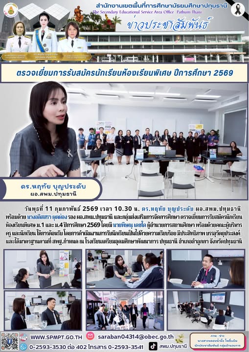 วันพุธที่ 11 กุมภาพันธ์ 2569 เวลา 10.30 น. ดร.หฤทัย บุญประดับ ผอ.สพม.ปทุมธานี พร้อมด้วย นางอลิสสรา ผุดผ่อง รอง ผอ.สพม.ปทุมธานี และกลุ่มส่งเสริมการจัดการศึกษา ตรวจเยี่ยมการรับสมัครนักเรียนห้องเรียนพิเศษ ม.1 และ ม.4 ปีการศึกษา 2569 โดยมี นายพิษณุ เดชใด ผู้อำนวยการสถานศึกษา พร้อมด้วยคณะผู้บริหาร ครู และนักเรียน ให้การต้อนรับ โดยการดำเนินงานการรับนักเรียนเป็นไปด้วยความเรียบร้อย มีประสิทธิภาพ บรรลุวัตถุประสงค์ และได้มาตรฐานตามที่ สพฐ.กำหนด ณ โรงเรียนเตรียมอุดมศึกษาพัฒนาการ ปทุมธานี อำเภอลำลูกกา จังหวัดปทุมธานี