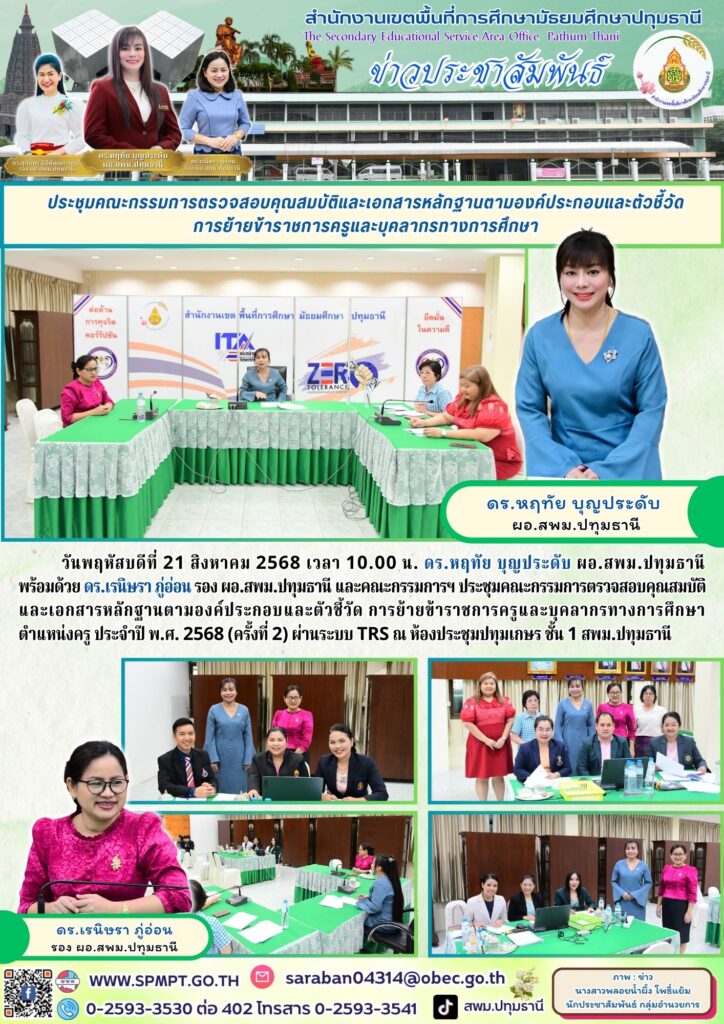 วันพฤหัสบดีที่ 21 สิงหาคม 2568 เวลา 10.00 น. ดร.หฤทัย บุญประดับ ผอ.สพม.ปทุมธานี พร้อมด้วย ดร.เรนิษรา ภู่อ่อน รอง ผอ.สพม.ปทุมธานี และคณะกรรมการฯ ประชุมคณะกรรมการตรวจสอบคุณสมบัติและเอกสารหลักฐานตามองค์ประกอบและตัวชี้วัด การย้ายข้าราชการครูและบุคลากรทางการศึกษา ตำแหน่งครู ประจำปี พ.ศ. 2568 (ครั้งที่ 2) ผ่านระบบ TRS ณ ห้องประชุมปทุมเกษร ชั้น 1 สพม.ปทุมธานี