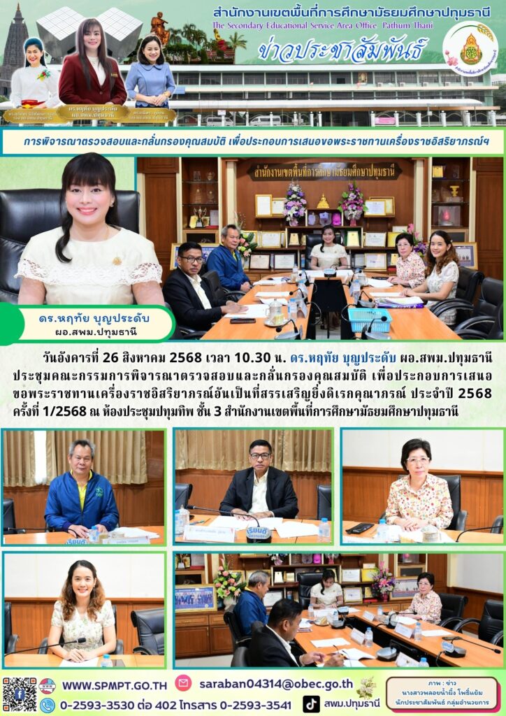 วันอังคารที่ 26 สิงหาคม 2568 เวลา 10.30 น. ดร.หฤทัย บุญประดับ ผอ.สพม.ปทุมธานี ประชุมคณะกรรมการพิจารณาตรวจสอบและกลั่นกรองคุณสมบัติ เพื่อประกอบการเสนอขอพระราชทานเครื่องราชอิสริยาภรณ์อันเป็นที่สรรเสริญยิ่งดิเรกคุณาภรณ์ ประจำปี 2568 ครั้งที่ 1/2568 ณ ห้องประชุมปทุมทิพ ชั้น 3 สำนักงานเขตพื้นที่การศึกษามัธยมศึกษาปทุมธานี