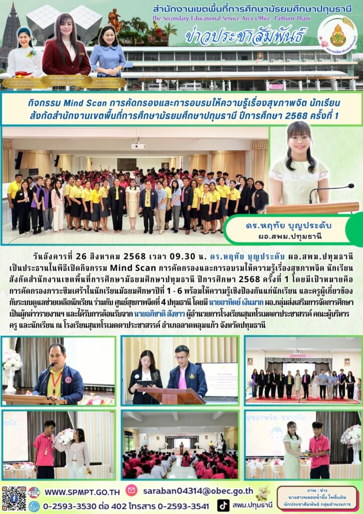 วันอังคารที่ 26 สิงหาคม 2568 เวลา 09.30 น. ดร.หฤทัย บุญประดับ ผอ.สพม.ปทุมธานี เป็นประธานในพิธีเปิดกิจกรรม Mind Scan การคัดกรองและการอบรมให้ความรู้เรื่องสุขภาพจิต นักเรียน สังกัดสำนักงานเขตพื้นที่การศึกษามัธยมศึกษาปทุมธานี ปีการศึกษา 2568 ครั้งที่ 1 โดยมีเป้าหมายคือ การคัดกรองภาวะซึมเศร้าในนักเรียนมัธยมศึกษาปีที่ 1 – 6 พร้อมให้ความรู้เชิงป้องกันแก่นักเรียน และครูผู้เกี่ยวข้อง กับระบบดูแลช่วยเหลือนักเรียน ร่วมกับ ศูนย์สุขภาพจิตที่ 4 ปทุมธานี โดยมี นายอาทิตย์ เงินมาก ผอ.กลุ่มส่งเสริมการจัดการศึกษา เป็นผู้กล่าวรายงานฯ และได้รับการต้อนรับจาก นายอภิชาติ สังขาว ผู้อำนวยการโรงเรียนสุนทโรเมตตาประชาสรรค์ คณะผู้บริหาร ครู และนักเรียน ณ โรงเรียนสุนทโรเมตตาประชาสรรค์ อำเภอลาดหลุมแก้ว จังหวัดปทุมธานี