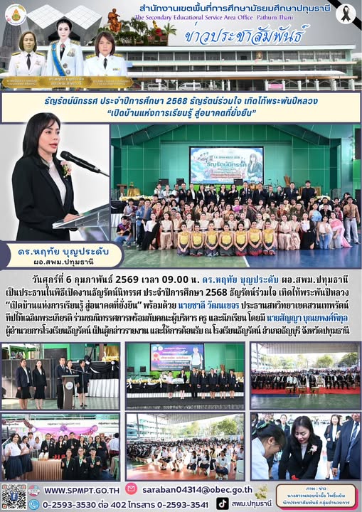 วันศุกร์ที่ 6 กุมภาพันธ์ 2569 เวลา 09.00 น. ดร.หฤทัย บุญประดับ ผอ.สพม.ปทุมธานี เป็นประธานในพิธีเปิดงานธัญรัตน์นิทรรศ ประจำปีการศึกษา 2568 ธัญรัตน์ร่วมใจ เทิดไท้พระพันปีหลวง “เปิดบ้านแห่งการเรียนรู้ สู่อนาคตที่ยั่งยืน” พร้อมด้วย นายชาลี วัฒนเขจร ประธานสหวิทยาเขตสวนเทพรัตน์ทีปไท้เฉลิมพระเกียรติ ร่วมชมนิทรรศการพร้อมกับคณะผู้บริหาร ครู และนักเรียน โดยมี นายสัญญา บุณยพงศ์พิกุล ผู้อำนวยการโรงเรียนธัญรัตน์ เป็นผู้กล่าวรายงาน และให้การต้อนรับ ณ โรงเรียนธัญรัตน์ อำเภอธัญบุรี จังหวัดปทุมธานี