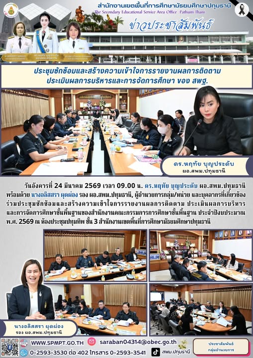 วันอังคารที่ 24 มีนาคม 2569 เวลา 09.00 น. ดร.หฤทัย บุญประดับ ผอ.สพม.ปทุมธานี พร้อมด้วย นางอลิสสรา ผุดผ่อง รอง ผอ.สพม.ปทุมธานี, ผู้อำนวยการกลุ่ม/หน่วย และบุคลากรที่เกี่ยวข้อง ร่วมประชุมซักซ้อมและสร้างความเข้าใจการรายงานผลการติดตาม ประเมินผลการบริหารและการจัดการศึกษาขั้นพื้นฐานของสำนักงานคณะกรรมการการศึกษาขั้นพื้นฐาน ประจำปีงบประมาณ พ.ศ. 2569 ณ ห้องประชุมปทุมทิพ ชั้น 3 สำนักงานเขตพื้นที่การศึกษามัธยมศึกษาปทุมธานี