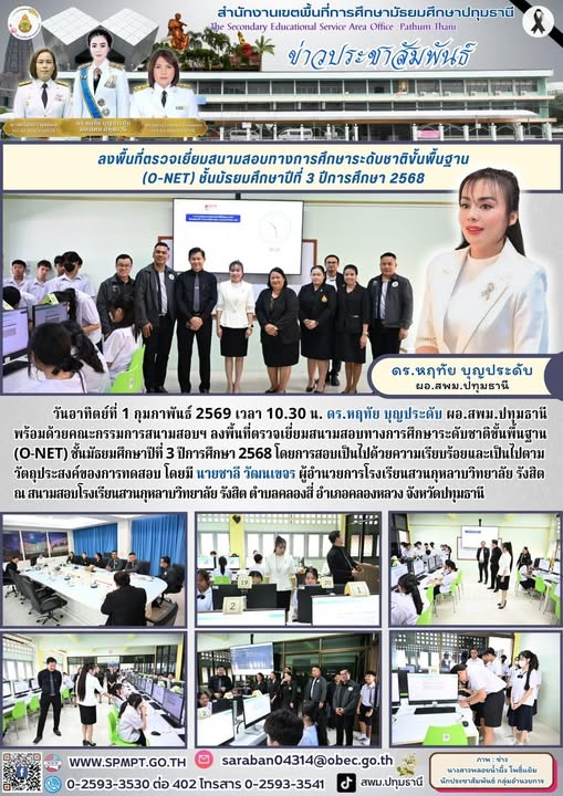 วันอาทิตย์ที่ 1 กุมภาพันธ์ 2569 เวลา 10.30 น. ดร.หฤทัย บุญประดับ ผอ.สพม.ปทุมธานี พร้อมด้วยคณะกรรมการสนามสอบฯ ลงพื้นที่ตรวจเยี่ยมสนามสอบทางการศึกษาระดับชาติขั้นพื้นฐาน (O-NET) ชั้นมัธยมศึกษาปีที่ 3 ปีการศึกษา 2568 โดยการสอบเป็นไปด้วยความเรียบร้อยและเป็นไปตามวัตถุประสงค์ของการทดสอบ โดยมี นายชาลี วัฒนเขจร ผู้อำนวยการโรงเรียนสวนกุหลาบวิทยาลัย รังสิต ณ สนามสอบโรงเรียนสวนกุหลาบวิทยาลัย รังสิต ตำบลคลองสี่ อำเภอคลองหลวง จังหวัดปทุมธานี