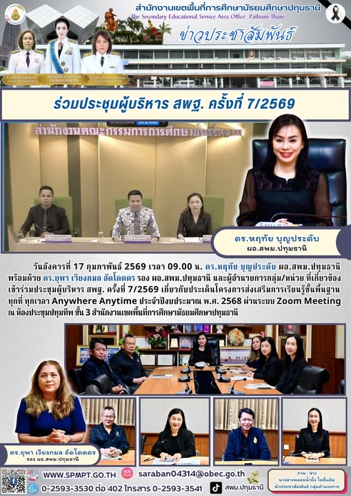 วันอังคารที่ 17 กุมภาพันธ์ 2569 เวลา 09.00 น. ดร.หฤทัย บุญประดับ ผอ.สพม.ปทุมธานี พร้อมด้วย ดร.ยุพา เวียงกมล อัดโดดดร รอง ผอ.สพม.ปทุมธานี และผู้อำนวยการกลุ่ม/หน่วย ที่เกี่ยวข้อง เข้าร่วมประชุมผู้บริหาร สพฐ. ครั้งที่ 7/2569 เกี่ยวกับประเด็นโครงการส่งเสริมการเรียนรู้ขั้นพื้นฐานทุกที่ ทุกเวลา Anywhere Anytime ประจำปีงบประมาณ พ.ศ. 2568 ผ่านระบบ Zoom Meeting ณ ห้องประชุมปทุมทิพ ชั้น 3 สำนักงานเขตพื้นที่การศึกษามัธยมศึกษาปทุมธานี